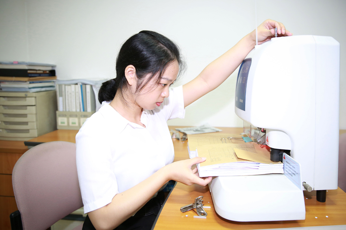 接下來進行的是憑證裝訂——隨著選手的坐定和計時人員的就位,緊張而激烈的憑證裝訂正式開始,選手們手、眼、腦配合,將憑證裝訂得平整、牢固、美觀,展示了良好的專業(yè)素養(yǎng)。