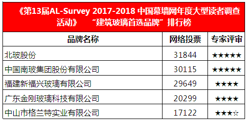 北玻股份憑借其專業的產品研發和精良的產品品質以及在市場中的地位,最終贏得廣大終端客戶、行業專家、設計院、顧問公司和媒體總編的高度認可,在第13屆AL-Survey2017-2018中國門窗幕墻行業大型讀者調查暨“我最喜愛品牌”評選活動中,成功衛冕“建筑玻璃十大首選品牌”大獎!