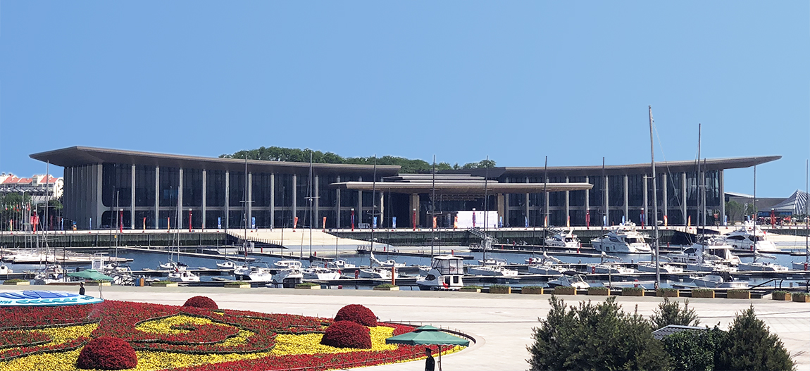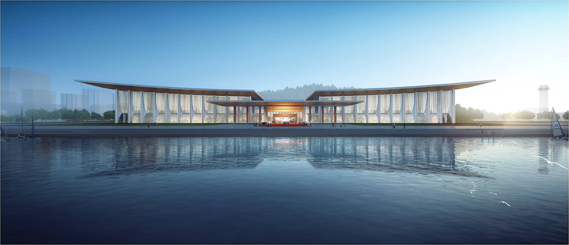 此次會(huì)議的主會(huì)場(chǎng)位于山東省青島市奧帆中心內(nèi),總用地面積3.1萬平方米,基地南北長(zhǎng)約273米,東西寬約70米。主會(huì)場(chǎng)的設(shè)計(jì)靈感來自青島翱翔的海鷗、海面遨游的帆船,以“騰飛逐夢(mèng)、揚(yáng)帆領(lǐng)航”為設(shè)計(jì)立意,以抽象、現(xiàn)代的建筑造型傳神再現(xiàn)中國(guó)傳統(tǒng)元素與地域海洋文化特性,共同融合成具有獨(dú)特性、標(biāo)志性、文化性、生態(tài)性的建筑形體。建筑物遠(yuǎn)看就像一只飛翔在鱗次櫛比的船帆上方的巨大海鷗,通體的超白玻璃幕墻,令賓客與海與山進(jìn)行互動(dòng),感受背山面海、海天一色、藍(lán)綠相映的壯美景象。